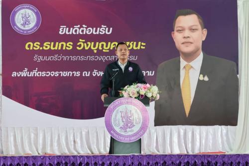 นายธนกร วังบุญคงชนะ รัฐมนตรีว่าการกระทรวงอุตสาหกรรม ลงพื้นที่ตรวจราชการและพบปะเยี่ยมเยียนผู้ประกอบการวิสาหกิจชุมชน ซึ่งจัดขึ้นโดยสำนักงานอุตสาหกรรมจังหวัดมหาสารคาม เพื่อยกระดับการพัฒนาอุตสาหกรรมชุมชนให้เติบโตอย่างยั่งยืน โดยมี นายชุมพิชญ์ เดชะรัฐ ผู้ว่าราชการจังหวัดมหาสารคาม พร้อมด้วย นายศิวะ โพธิตาปนะ อุตสาหกรรมจังหวัดมหาสารคาม หัวหน้าส่วนราชการ ผู้ประกอบการ และประชาชน ร่วมให้การต้อนรับ