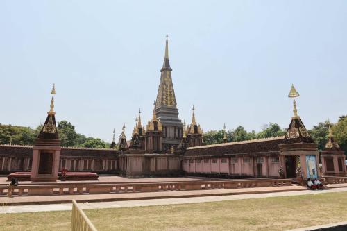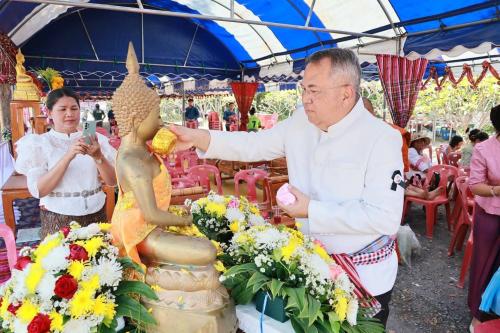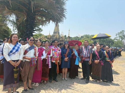 โอกาสนี้ ผู้ว่าราชการจังหวัดมหาสารคาม ได้นำคณะเยี่ยมชมและกราบสักการะองค์พระธาตุอินทร์แปลง ซึ่งเปรียบเสมือนศูนย์รวมจิตใจของชาวบ้านแก่นท้าวและพุทธศาสนิกชนทั่วไป โดยองค์พระธาตุแห่งนี้เริ่มสร้างขึ้นด้วยดำริของหลวงพ่อสมาน โอภาโส (อดีตเจ้าอาวาส) ที่ได้นำพุทธศาสนิกชนผู้มีจิตศรัทธาร่วมกันสร้างขึ้น ด้วยศิลปะผสมผสานที่ได้รับแรงบันดาลใจจากองค์พระธาตุพนม การประดับส่วนยอดจำลองจากพระบรมธาตุนาดูน ขณะที่วิหารคดและการวางภูมิทัศน์ใช้สถาปัตยกรรมแบบขอมโดยมีบ่อน้ำทั้งสี่ทิศ และใช้ศิลปะแบบบาหลีในการตกแต่งลวดลายปูนปั้นอย่างวิจิตรงดงาม